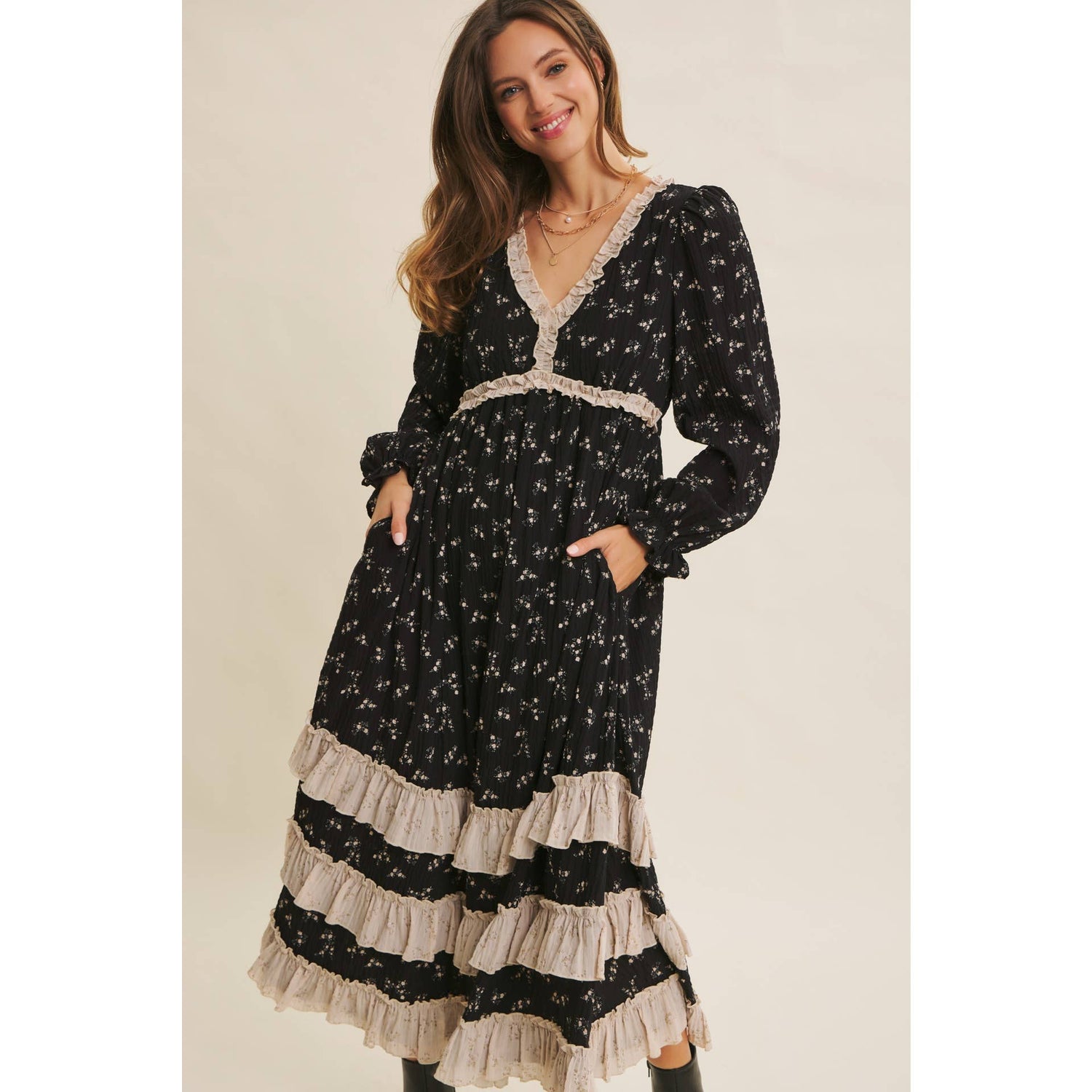 A poetic nod to prairie romance, this floral maxi dress captures the charm of countryside styling with a refined silhouette. Designed with a textured base and delicate ditsy print, it features soft ruffle trims in a contrast tone that cascade down the skirt for a tiered, movement-filled finish. The feminine V-neckline and waist flatter the figure, while long balloon sleeves and soft lining ensure comfort and coverage. Finished with side pockets and maternity-friendly ease, this style is equally lovely dressed up for fall gatherings or layered under cozy knits, as seen in our seasonal lookbook. With its thoughtful details and timeless floral print, it’s the kind of piece that transitions effortlessly from everyday beauty to special occasion charm.